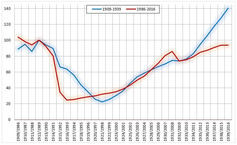 Примечание: В периоде 1909-1939 гг., 1912 год принят за 100; в периоде 1986-2016, 1989 год принят за 100.