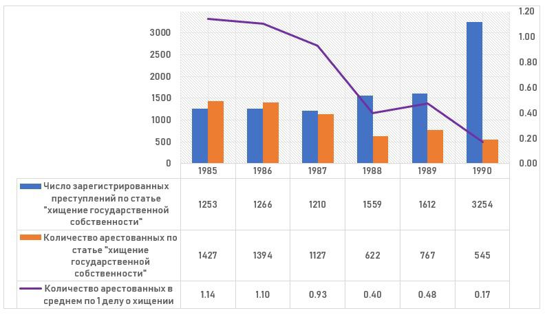 Среди перечисленных выше факторов особо следует выделить процесс деинституционализации, повлиявший, в числе прочих, на качество исполнения регуляторных функций государством. Прекратили существование такие институты как ОБХСС, характерные для плановой экономики. Однако массовое обнищание населения и в том числе госслужащих, отсутствие замещающих институтов и отсутствие внешнего контроля из союзного центра, привели к росту преступлений коррупционного характера и отсутствию адекватной реакции на это еще в позднесоветский период. Уже в 1990 году был налицо взрыв коррупционной активности, который лишь усилился после обретения Арменией независимости. Рассмотрим данные, которые могут иллюстрировать вышесказанное.