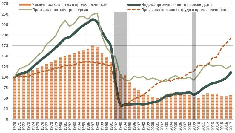 Как видно из графика выше, во второй половине 2010-ых гг., промышленность Армении лишь незначительно превысила уровень начала 1970-ых гг., а по сравнению с пиковым значением, зафиксированным в 1987 году, улучшение зафиксировано лишь с точки зрения роста производительности труда. В частности, объем промышленного производства в 2017 году составил 47% от уровня 1987 года, количество произведенной электроэнергии – 51%, численность занятых – 33%, производительность труда – 143%. Эти цифры характеризуют динамику деиндустриализации Армении, о чем также свидетельствуют многочисленные здания, в которых находились промышленные предприятия, ныне не действующие.