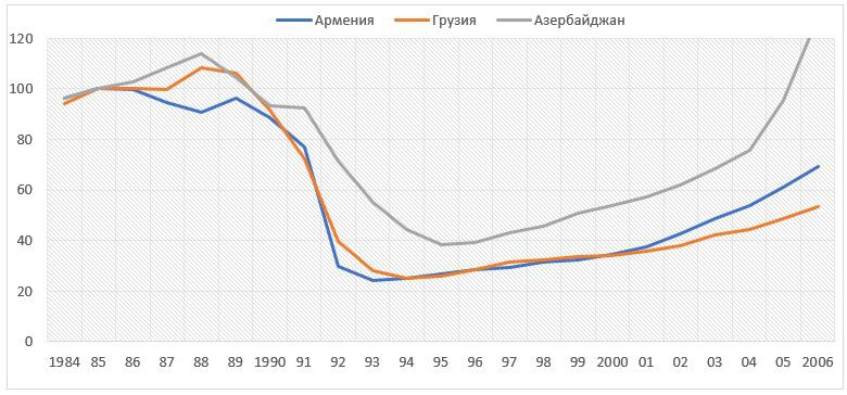 Примечание: для каждой страны значение ВВП за 1985 год принято за 100. Стоит учитывать, что для Грузии использованы официальные данные, для Армении – альтернативные. Данные Азербайджана, использованные в расчетах, также официальные, но они могут быть частично или полностью недостоверными.