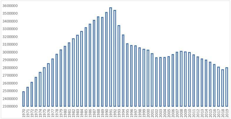 Источник: Демоскоп (1970-1990)[27], расчеты автора (1991-2019). / см. Население Армении завышено на 200 тысяч человек