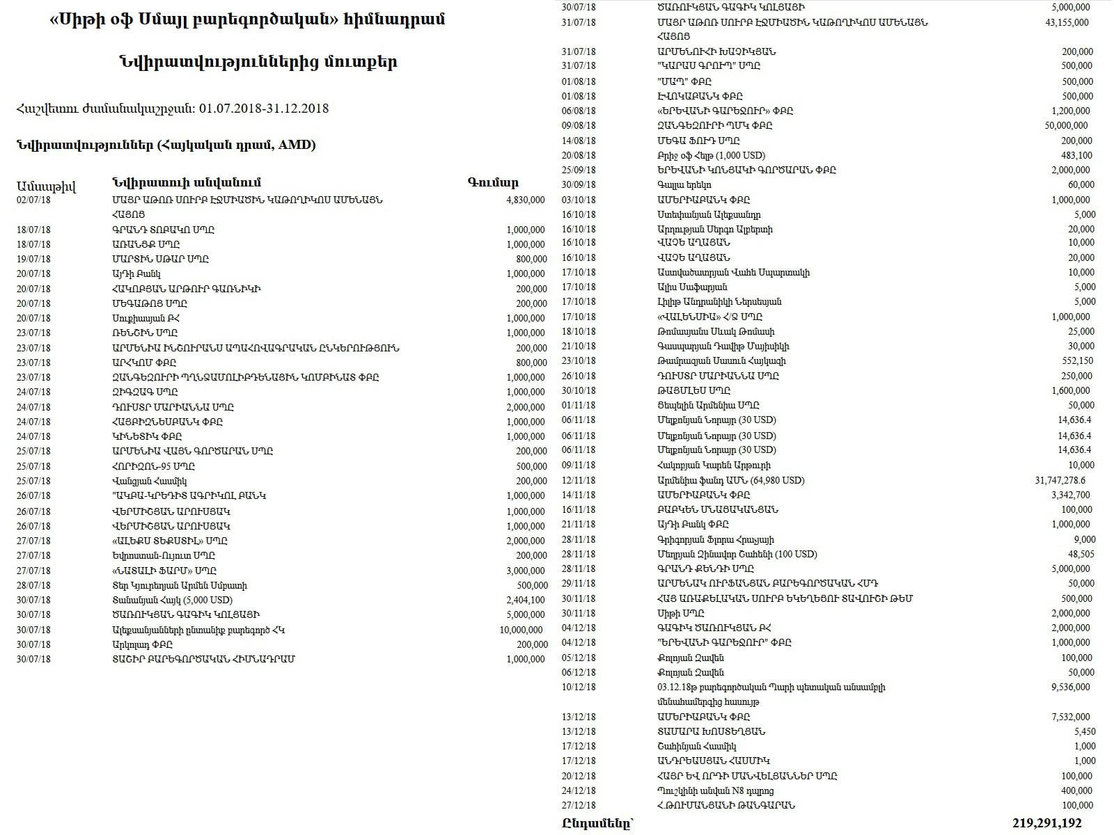 Также пожертвования получил фонд жены Пашиняна Анны Акопян – «Город улыбки» (City of smile), получивший на данный момент 544 тысячи долларов. Список пожертвований за 2019 год доступен по ссылке здесь, можно также посмотреть список пожертвований в 2018 году. Интересно, однако, что в изначальной публикации были также указаны даты и размер отдельных пожертвований, а не сумма по жертвователям. Изначальная публикация была удалена, когда пользователи соцсетей усмотрели связь между пожертвованиями со стороны св. Эчмиадзина и давлением на католикоса, а также нападениями в июле 2018 года, кроме того, крупные пожертвования были сделаны Самвелом Алексаняном и Гагиком Царукяном, а оппозиционеры связывали пожертвования с кратным снижением размера штрафов и так далее. Не знаю, насколько это так, но в любом случае факт сбора пожертвований от олигархов примечателен. Исходный документ находился по ссылке: www.cityofsmile.org/wp-content/uploads/2019/01/նվիրատվություններ-01.07.2018-31.12.2018.pdf Я нашел его в кэше Гугла по ссылке, а поскольку эта ссылка скоро перестанет действовать, включаю его также в виде скриншота (на армянском).
