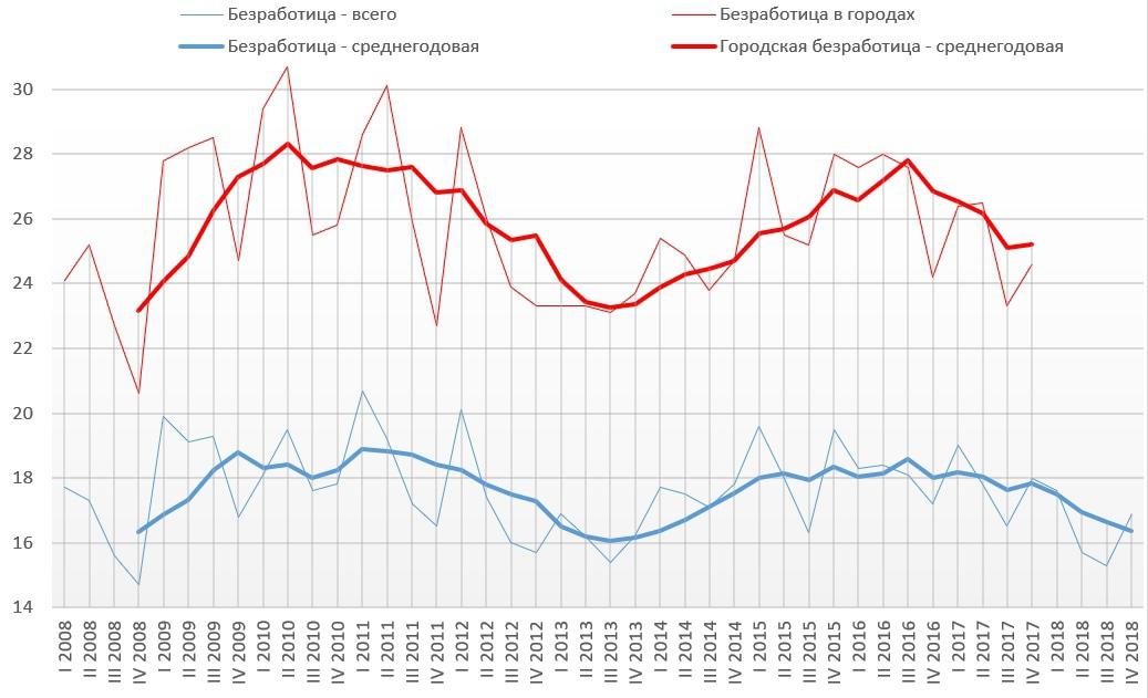 Примечание: значительное расхождение между городской и общей безработицей вызвано методологическим подходом, согласно которому все сельские жители, имевшие в собственности скот и участки земли, считались занятыми. В 2018 году эта методология была пересмотрена, что привело к повышению общего уровня безработицы на 3%.