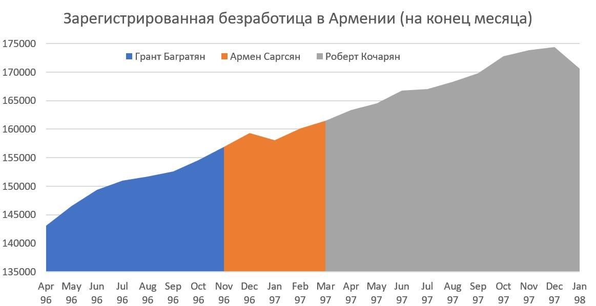 Как мы видим, в вопросе безработицы никакого перелома в первый период премьерства Кочаряна не было, но уже к самому концу замедлился рост числа безработных, а в начале 1998 года оно стало сокращаться. Так что менее чем за год изменился тренд.