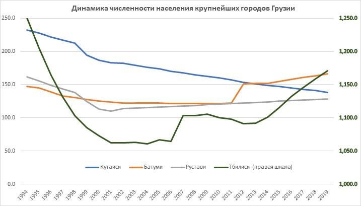 В действительности Кутаиси все еще второй город Грузии, поскольку, исключив из населения Батуми прирезанные к нему поселения, получается около 138 тысяч человек, в Рустави 128.3 тысячи, а в Кутаиси пока что 138.2 тысячи. Но учитывая, что население Батуми растет на 2800 человек в год, Рустави на 800, а Кутаиси снижается на 2600 человек в год, уже в 2020 году Батуми превысит Кутаиси по численности населения, а Рустави может обойти Кутаиси в 2022 году и тогда Кутаиси станет четвертым городом Грузии.