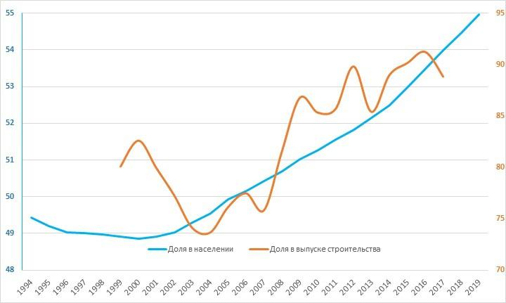 3. Динамика доли растущих регионов в численности населения и в выпуске сектора строительства