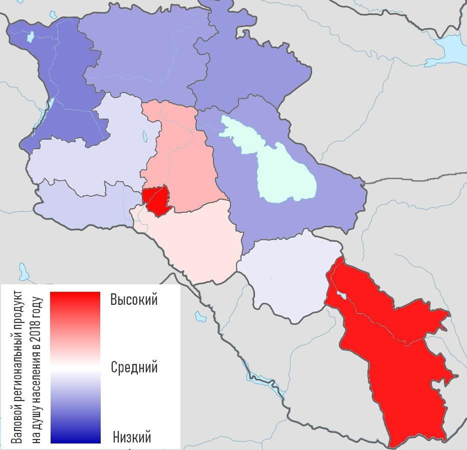 Впервые Статистический комитет Армении рассчитал ВРП Армении в начале 2018 года – за 2015 и 2016 гг. Эти данные были представлены в приложении 2 к сборнику «Социально-экономическое положение Армении в январе-декабре 2017 года», на странице 253. Просмотреть их можно по ссылке. Однако я уже рассчитывал валовой региональный продукт Армении (а также Грузии) еще раньше. Результаты представил в виде карты в сборнике «Экономическое измерение сотрудничества между Арменией и Грузией: новые вызовы и возможности», изданном в 2015 году (стр. 55-56). Сайт института на протяжении нескольких дней, поэтому для просмотра документа можете воспользоваться ссылкой на вебархив.