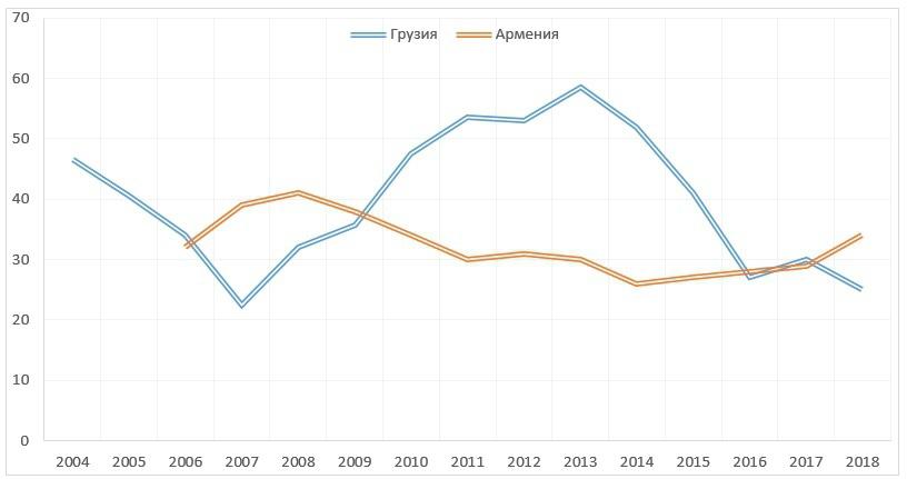 Примечание: данные по Армении – Gallup Inc., по Грузии – IRI (если за год более одного опроса, то среднее по всем за год).
