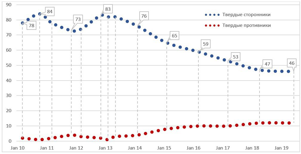Однако и с западными структурами ситуация далеко не однозначная. Уровень поддержки вступления в Европейский Союз снижается. Число твердых сторонников вступления в Евросоюз упало, а число твердых противников – выросло. Суммарно число сторонников вступления в Евросоюз упало с 90% в марте 2017 и 85% в апреле 2018 г. до 75% в мае-июне 2019 г. В Грузии идет процесс формирования евроскептических настроений, поскольку снижается доля людей с промежуточным мнением и растет доля противников. Число твердых противников пока невелико – 8%, но оно растет и растет довольно быстро. То же самое, но в еще более выраженном виде касается и НАТО. Данные представлены на графике ниже.