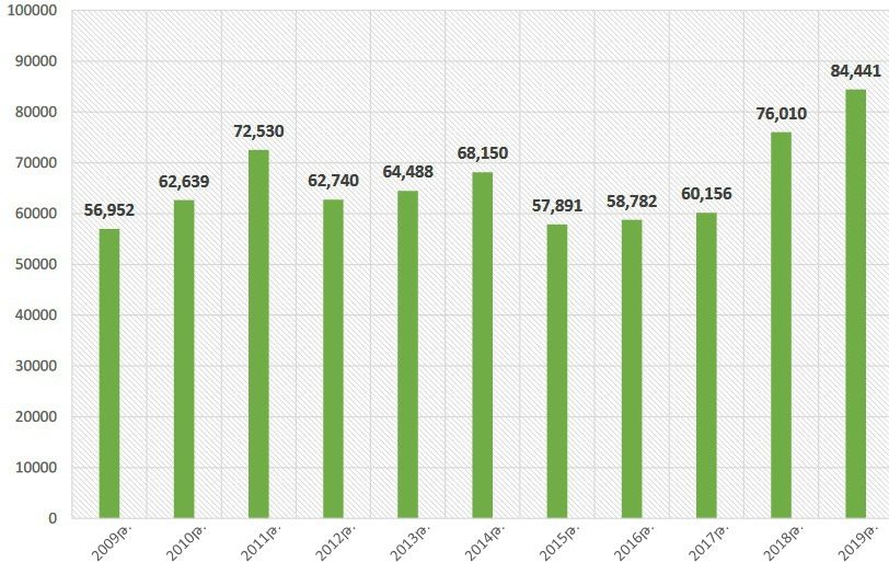 График 1. Динамика числа сделок на рынке недвижимости Армении за первое полугодие 2009-2019 гг.
