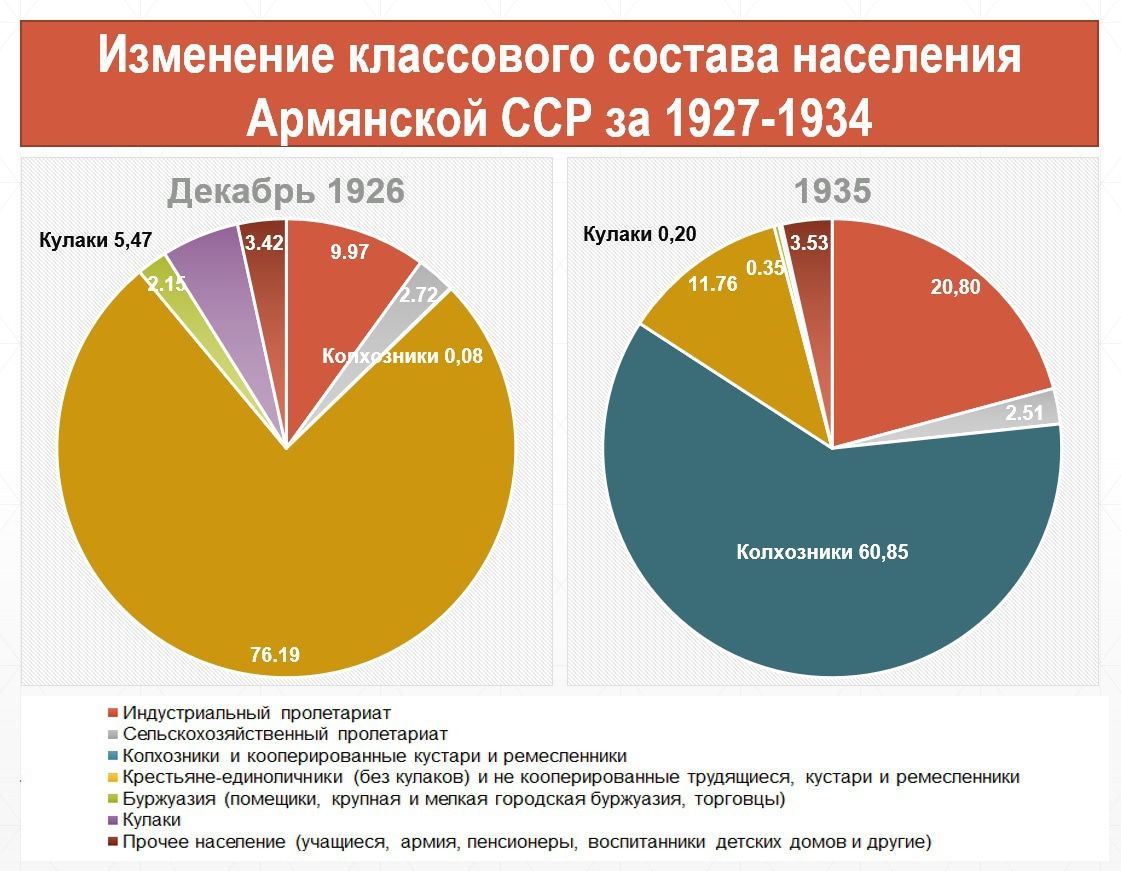 Термин "Великий перелом" подразумевает, что это не было эволюционное развитие, заданное предшествующими годами Советской власти. Напротив, Великий перелом стал следствием волевого усилия Сталина и был проектом, в который он вложил весь свой политический капитал, накопленный за предыдущие годы. Но потратившись на переворот во всех областях общественной жизни, он же и стал его бенефициаром. Для характеристики «великого перелома» предлагаю взглянуть на изменение социальной/классовой структуры населения Советской Армении с 1927 по 1934 год.Вы можете увидеть как всего за несколько лет изменилась вся общественная структура.
