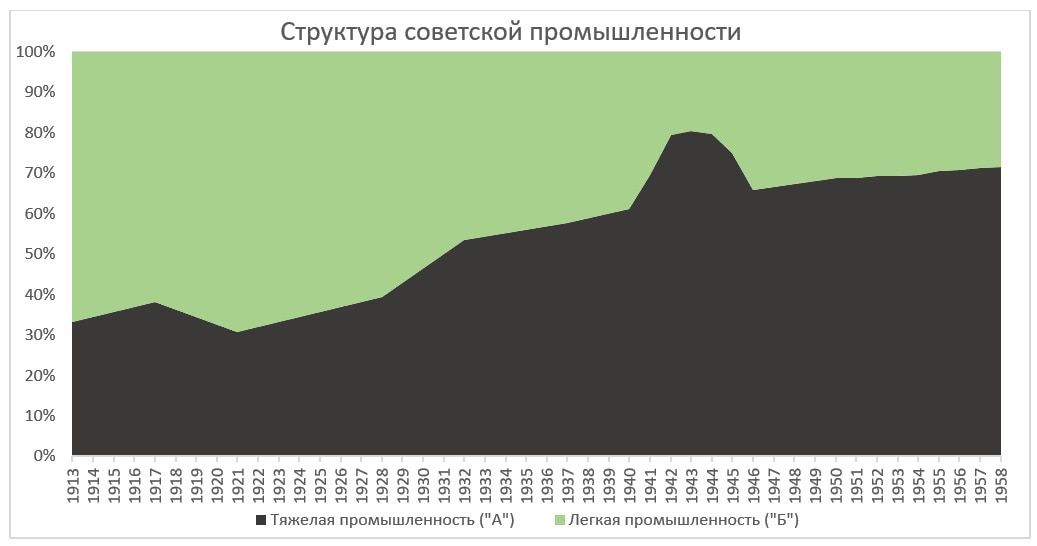 В Советском союзе, как я уже отмечал, было принято разделение промышленности на две группы – «производство средств производства» (группа А) и «производство предметов потребления» (группа Б). Первая категория включала в себя металлургию, химическую и прочую тяжелую промышленность, машиностроение, станкостроение и военную промышленность. Группа Б – это легкая и пищевая промышленность. Преимущество отдавалось группе «А», в результате чего она очень быстро росла за счет всех остальных секторов экономики. Более того, советская индустриализация, собственно, касалась исключительно группы «А», тогда как промышленность группы «Б» развивалась наравне со всеми остальными секторами. На графике ниже – динамика структуры промышленности.