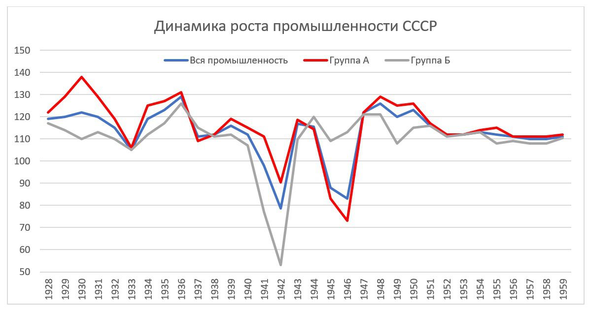 Такое преобладание тяжелой промышленности было достигнуто благодаря тому, что все средства из экономики инвестировались в нее. Она же и показывала самые высокие темпы роста. По официальным данным, в 1955 году вся советская промышленность выросла в 20.6 раз по сравнению с 1928 годом, при этом, промышленность группы «А» выросла в 39 раз, а группы «Б» - всего в 9 раз.