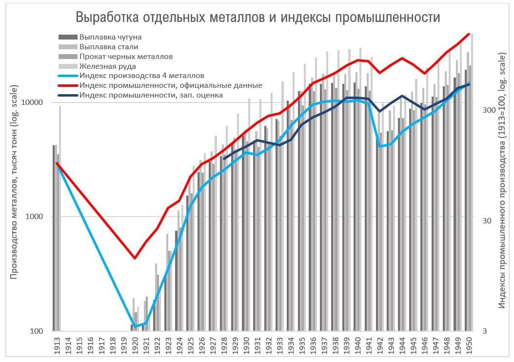 На графике выше мы видим очень интересную тенденцию. Я составил индекс производства 4 металлов, представленных выше к 1913 году, и он показывает примерно те же тенденции, что и индекс промышленности, реконструированный западными экономистами, тогда как советский индекс промышленности вновь сильно искажает ситуацию. Интересно, что в среднем объем производства 4 металлов превысил уровень 1913 года в 1929 году, а к 1950 году превысил его уже в 5 раз.