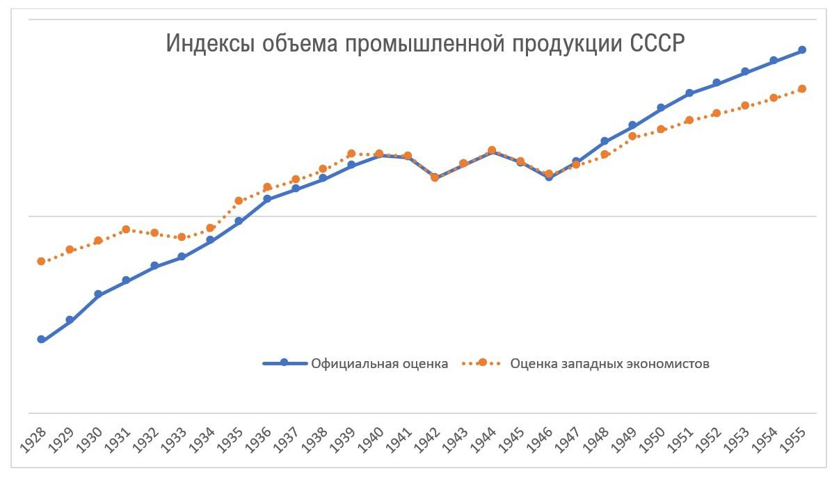 В оценках роста промышленности СССР существует серьезное расхождение. Советские официальные источники показывают куда более высокие темпы роста, чем альтернативные оценки. Чаще всего, было вызвано недооценкой дефлятора, чаще всего намеренной. В результате Советский Союз постоянно рос в разы быстрее США, но никак не мог их догнать и даже сократить отставание, причем не только в абсолютном измерении, но и в относительном. Также, накопленные темпы роста оказывались совершенно неадекватными, так, например, получалось, что объем промышленного производства в 1987 году превысил уровень 1928 года в 284 раза, а уровень 1921 года – в 1900 раз!