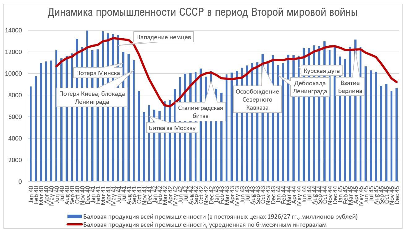 Как мы видим из графика, потеря основных промышленных центров отрицательно влияла на объем пром. производства, а победы часто влияли положительно, хотя здесь дело не в том, что по мере возврата территорий рос промышленный потенциал, поскольку часто возвращенные города были сильно разрушены. Скорее победы оказывали положительный эмоциональный и политический эффект. Хотя так было не всегда, например, окончание Сталинградской битвы имело противоположный эффект. Сложно сказать, почему именно. Возможно, из-за больших потерь в ходе этой битвы и всех сражений того периода. Ну и надо отметить, что после взятия Берлина в начале мая, производство военной продукции было сильно сокращено, что мы и видим на графике. Как и следовало бы ожидать, максимума скользящая средняя за 6 месяцев линия достигла в мае 1941 года, а минимума – в апреле 1942 года. В декабре 1945 года это значение было на 30.5% меньше, чем в мае 1941 года.
