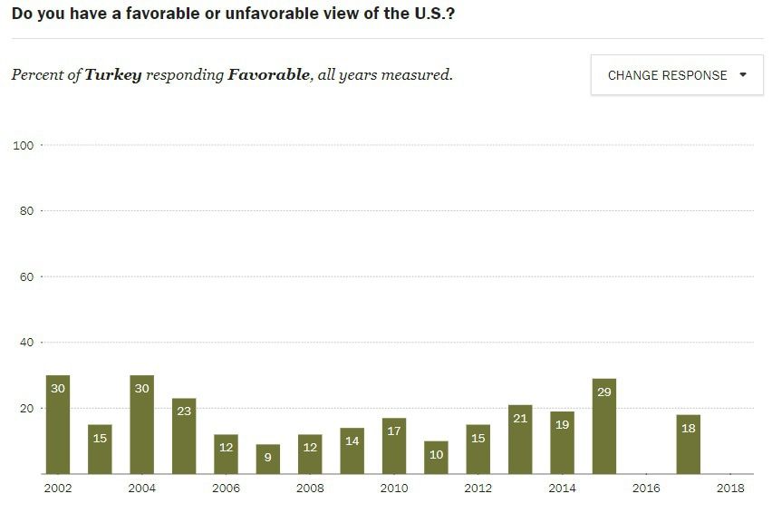 Турецкая интервенция в Сирию ухудшила и без того напряженные американо-турецкие отношения. Турция начала действовать односторонне, без оглядки на других, также Турция купила у России противоракетные комплексы «С-400», против чего США выступали активно. Турция высказывает альтернативную позицию в НАТО и вообще не испытывает солидарности к альянсу. Это логичное развитие событий – Турция становится более независимой и самостоятельно определяет свою внешнюю политику – и на нее все больше влияет исламский фактор и общественное мнение. Общественное мнение в Турции крайне отрицательно настроено в отношении США, причем еще до прихода Эрдогана к власти, особенно на фоне войны в Ираке. Скорее приход Эрдогана к власти стал следствием этих настроений, но он же их дополнительно усилил. На графике ниже представлена динамика доли опрошенных, положительно относящихся к США в Турции.
