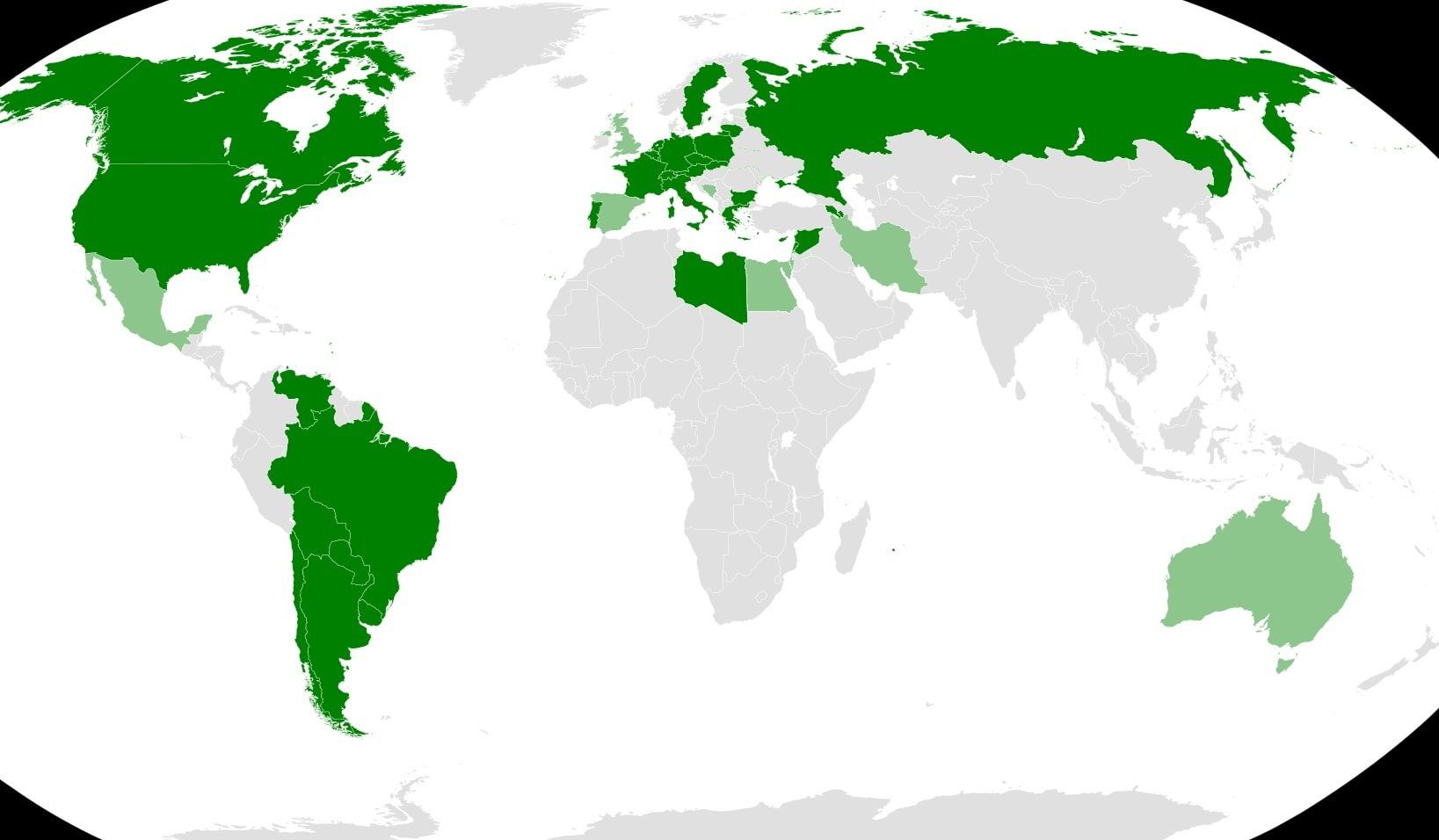 Признавшие страны отмечены темно-зеленым цветом, светло-зеленым отмечены страны, где отдельные законодательные органы или главы государства заявляли о необходимости признания геноцида.
