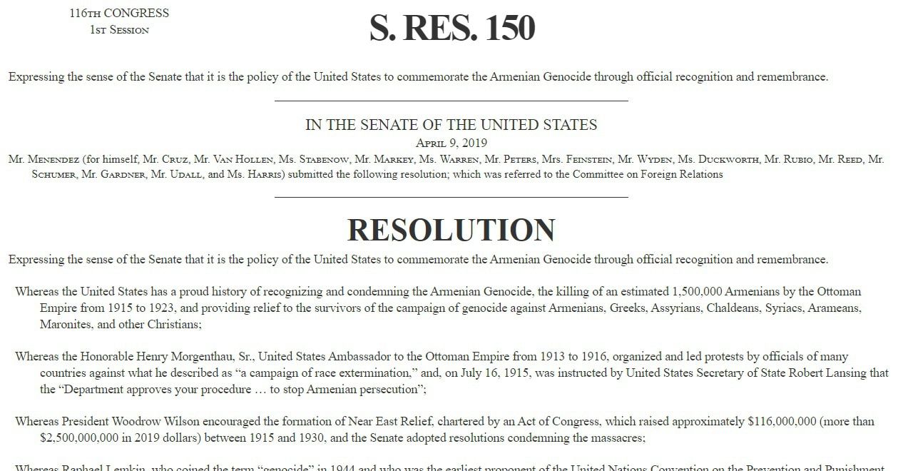 Сенат выражает необходимость официального признания и увековечения Геноцида армян в рамках политики Соединенных Штатов. США гордятся своей историей признания и осуждения Геноцида армян, убийства около 1,500,000 армян Османской империей в период с 1915 по 1923 гг. и оказания помощи выжившим в геноцидальной кампании армянам, грекам, ассирийцам, халдеям, сирийцам, арамейцам, маронитам и другим христианам;
