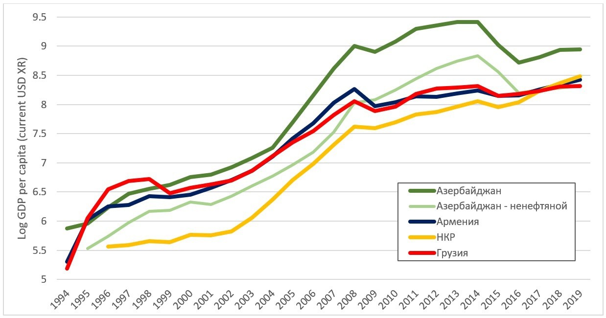 График 1. Динамика ВВП Южного Кавказа в 1994-2019 гг., долл. на душу населения, в текущих ценах, log