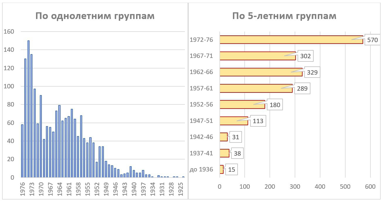 Таблица 2. Количество погибших на войне, извлеченное из поименного списка, по годам