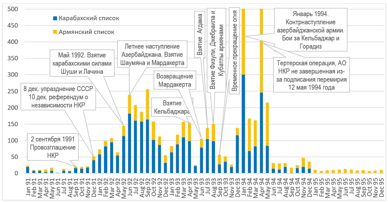 Таким образом, поименно нам известны 5000 бойцов, погибших в годы войны с известной точной датой и местом смерти. Я совместил оба списка, но поскольку обрабатывать «карабахский список» пришлось вручную, я прошел ровно половину и удвоил получившиеся показатели по датам смерти. Это важнейший индикатор динамики напряженности в войне. Разделение на «армянский» и «карабахский» списки условно, поскольку эти списки не очень точно разделены. В Карабахский список включены помимо тех, кто родился в Карабахе, еще и бакинские армяне, а также выходцы из других регионов Азербайджана, а изредка – и из Армении. В «армянский список» включены в основном выходцы из Армении, но там есть представители диаспоры, часть выходцев из Баку и в редких случаях Карабаха.