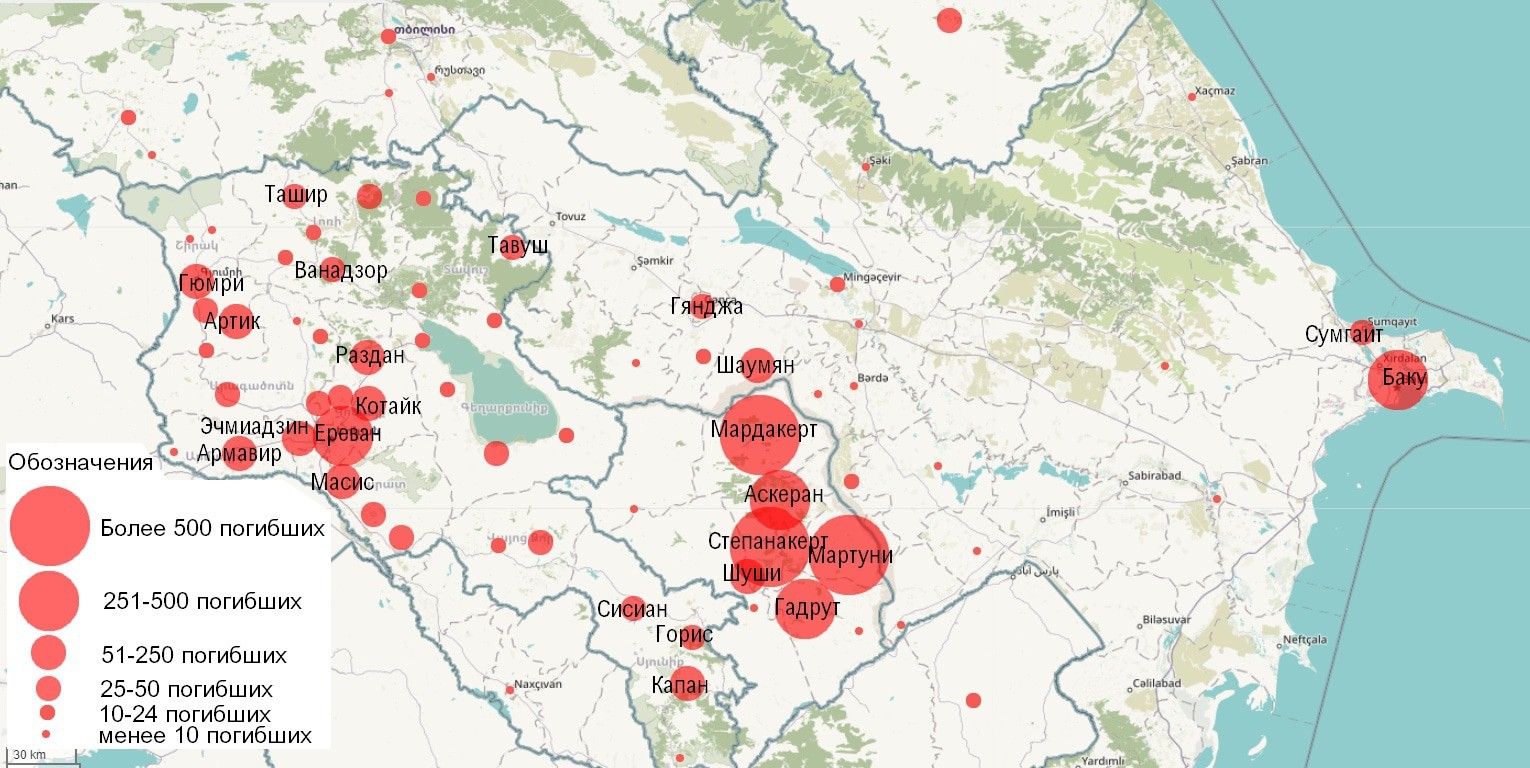 В строке «всего» я не делал прямого суммирования, так как суммирование чисел 2000 и 169 не дает 169. 2000 – округленное и неполное число, а поскольку все числа в этой таблице дают занижение, я, соответственно, округлял вверх. По этой таблице получается суммарное число погибших в размере около 16.3 тыс. чел, но это только для тех, относительно которых есть представление по поводу даты их смерти и эти данные официально подтверждены. В действительности, чаще всего считается число погибших в примерно два раза большем количестве. В частности, Томас Гольц называл цифру в 30 тыс. убитых на войне, в том числе большинство – азербайджанцы, а Государственный департамент США в качестве основной считает цифру в 25 000 человек.