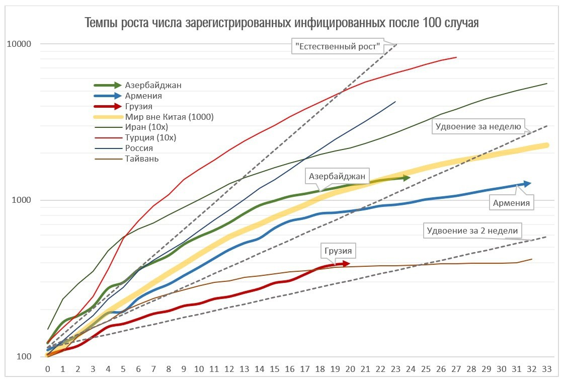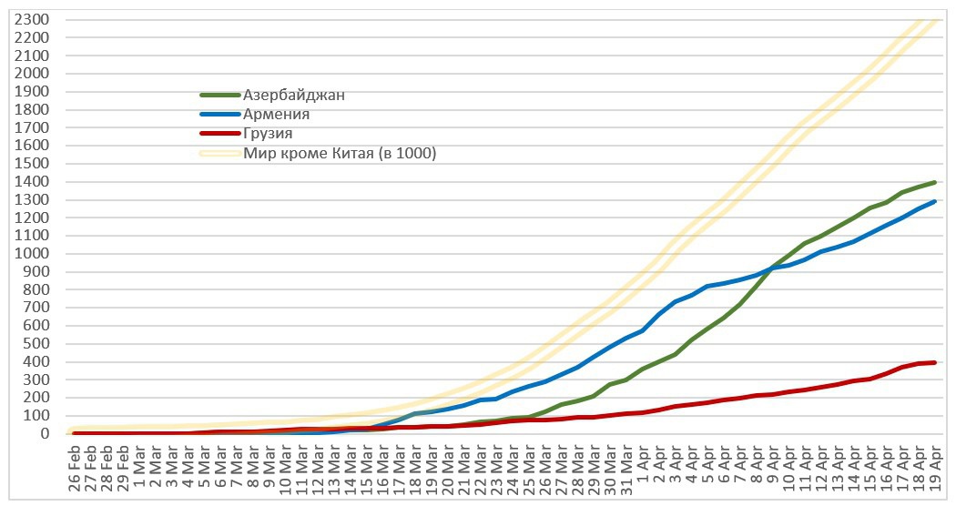 Примечания: * Жирным цветом выделяется самый большой среди стран показатель распространения вируса, ** курсивом выделяется самый низкий показатель распространения в регионе. a В пересчете на количество населения, согласно демографическим расчетам автора,  b Азербайджан – 6.2 млн человек, c Грузия – 3.9 млн человек, d Армения – 2.8 млн человек, e Весь регион Южного Кавказа – 12.9 млн человек.