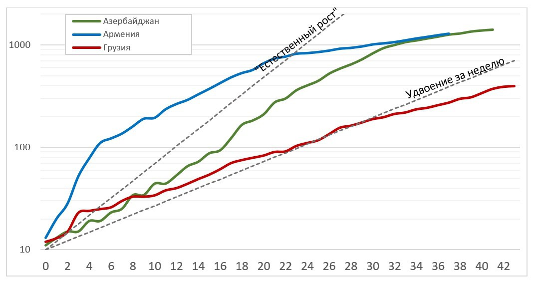 А вот если исключить случаи в рамках первой сотни, то траектории несколько меняются. Мы видим несколько интересных вещей здесь. Самое интересное, на мой взгляд, касается России, точнее, темпов роста в ней. Они на текущую дату самые большие из всех приведенных стран. Что касается Южного Кавказа, то общие закономерности мы уже увидели выше.
