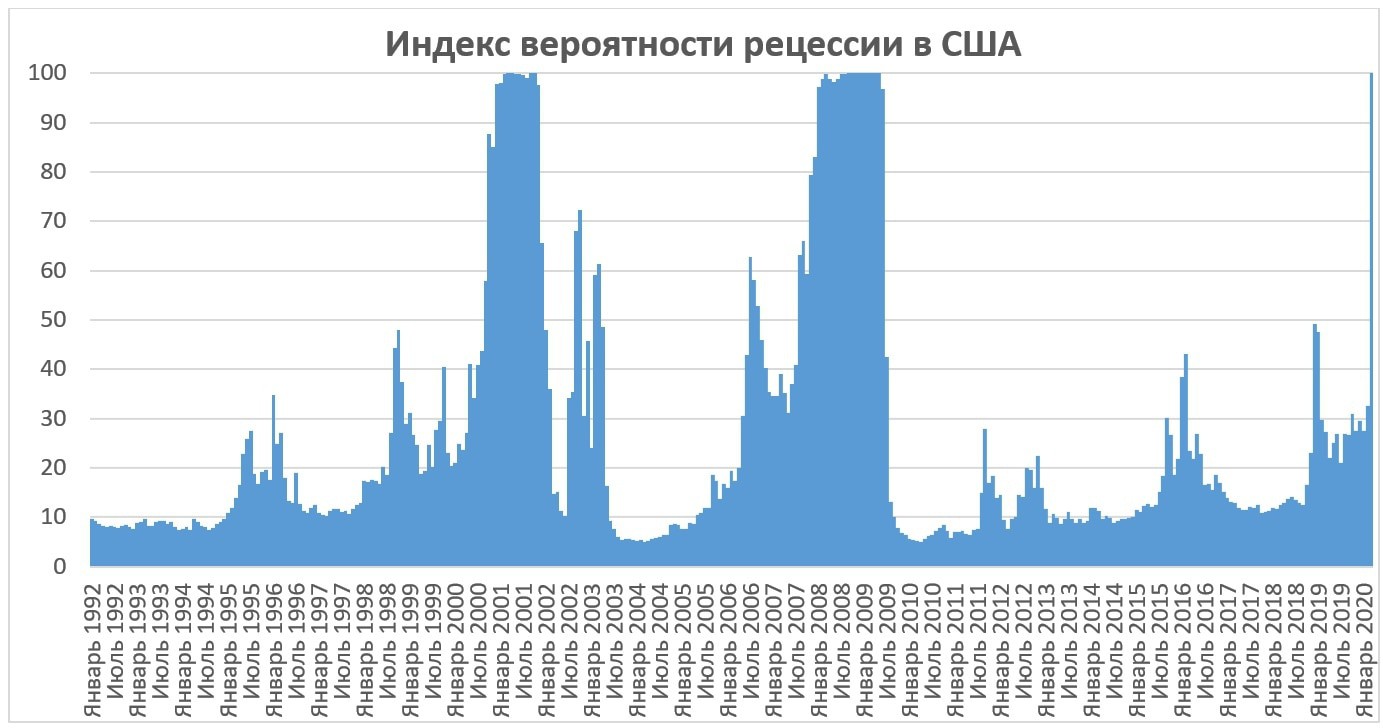 Как мы видим, за исключением флуктуаций 2013, 2016 и 2019 гг., риск кризиса медленно нарастал и уже в декабре 2019 года, когда никто еще ни о каком коронавирусе не знал, этот риск составлял 30%, причем это уже не флуктуация, а системный рост (несмотря на хорошие показатели роста ВВП и трудового рынка, а также фондовой биржи). Случилась бы рецессия в 2020 году без коронавируса или нет – сказать уверенно нельзя, но в условиях существовавших дисбалансов и обострявшейся торговой войны с Китаем, а также бурного политического начала года, ожидать ее можно было. К тму же, опыт предыдущих кризисов показывает, что перед кризисом вероятность росла со средних 10% до 30%, а уже потом – и до 100% (в этом смысле прогностическая ценность модели неплохая и вполне укладывается в нынешний кризис).