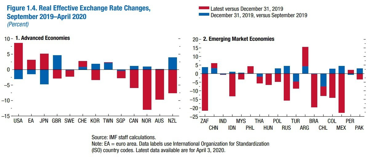 В самом докладе говорится в основном о пандемии, ее экономических последствиях и о том, как это сказывается на сырьевых рынках и финансовой стабильности стран. МВФ прогнозирует, что в 2020 году каждые 9 из 10 стран столкнется с рецессией, а валюты большинства развивающихся стран и части развитых – уже показали снижение к концу 2019 года.