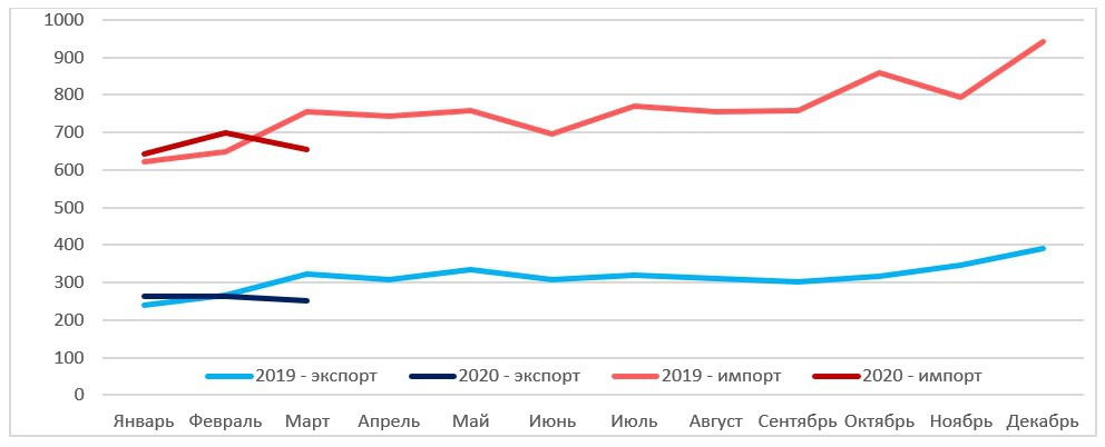 По экспорту – в январе рост составлял 10%, в феврале он уже составил -0.5%, а в марте -22%. Аналогично и с экспортом; особенно заметно сокращение в сфере транспортных средств, то есть, реэкспорт автомобилей в соседние страны. Стоит отметить, что если исключить реэкспорт, то «местный экспорт» составил 194.4 млн долл. в марте 2020 года и сократился на 7%, то есть был куда стабильнее, чем реэкспорт.