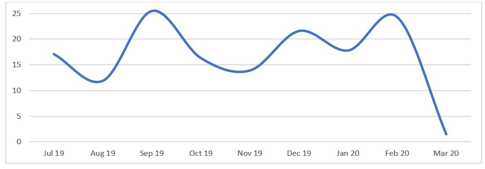 По Армении, к сожалению, у нас пока никаких показателей нет за исключением рынка недвижимости. В марте 2020 года было заключено 15,442 сделки на рынке недвижимости по сравнению с 15,213 сделками в марте 2019 года, то есть был рост. Но этот рост куда меньше, чем тот, что фиксировался до сих пор. Если экстраполировать предшествовавшие тенденции, то имеется сокращение относительно потенциального показателя на 15-17%. Динамика темпов роста представлена ниже.