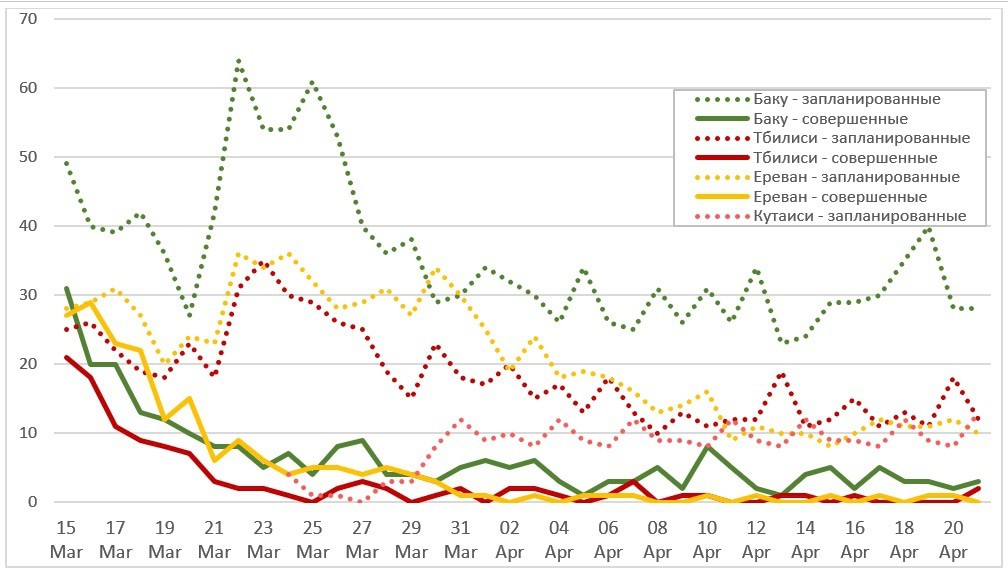 В Тбилисском аэропорту трафик упал больше чем в бакинском – и примерно на столько же, как в ереванском, но это произошло еще раньше. Если 15 марта состоялся 21 рейс, то в среднем за 15-31 марта состоялось 5.4 рейсов в сутки (-77% к запланированным и -90% к ожидаемым), а в апреле в среднем в сутки состоялось 0.8 рейсов (-94% к запланированным и -98.5% к ожидаемым).