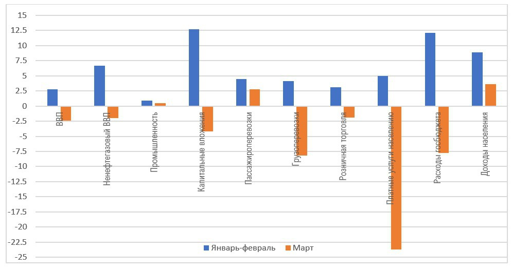 По Азербайджану уже доступны многие макроэкономические данные, в том числе по валовому внутреннему продукту. Если за январь-февраль темпы роста были следующими: весь ВВП – прирост на 2.8%, ненефтегазовый ВВП – прирост на 6.7%, то совокупно за январь-март цифры упали до 1.1% и 3.5% соответственно. Оценочно, если смотреть чисто на март, то оценочно, рост ВВП составил -2.4%, ненефтегазовый сектор -2.0%. Я оценил также темпы роста других макроэкономических показателей.