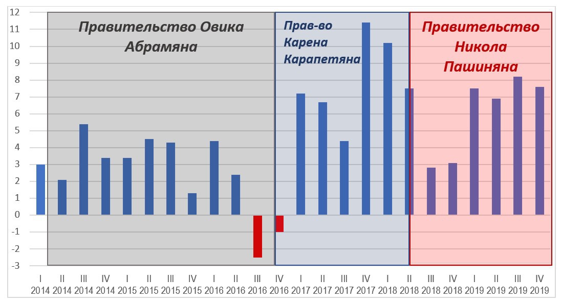 В экономике удалось не допустить спада в 2018 году и восстановить темпы роста, заданные правительством Карена Карапетяна. (ВВП на душу населения стран Южного Кавказа. Обогнала ли Армения соседей?На графике представлены темпы роста валового внутреннего продукта за последние годы – по кварталам.