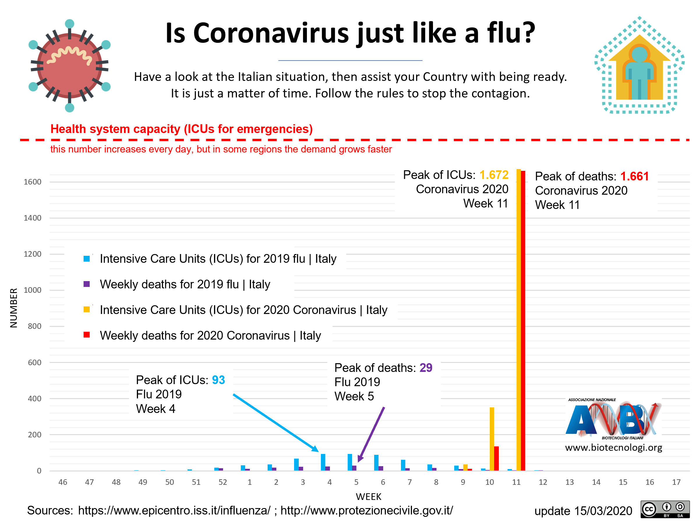 При этом стоит учитывать, что на пике от коронавируса умерло за неделю 7000 человек в Италии (включая примерно 50% тех, кто не были зарегистрированы по этой статье), а на пике от гриппа умерло 46 человек, несмотря на все карантины, международную помощь и мобилизацию всех врачей.