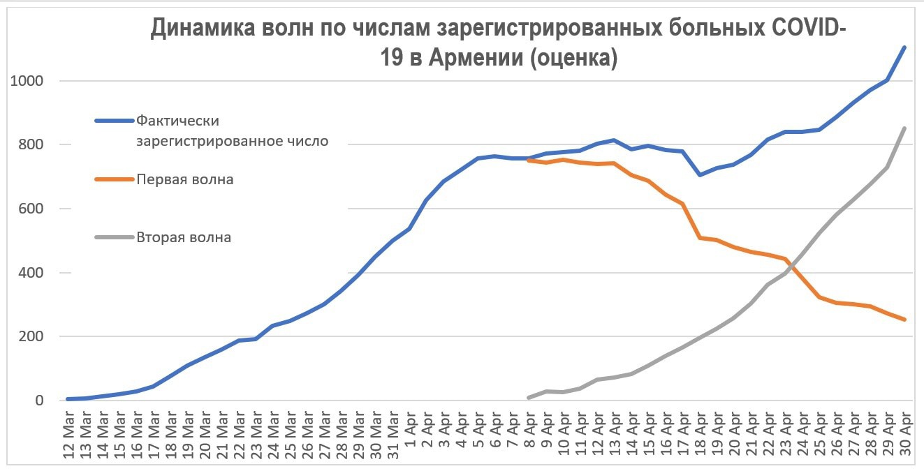 Начиная с 16 марта в Армении действовал режим чрезвычайного положения. Это привело к снижению темпов распространения коронавируса, в результате чего изначальный «взрыв» был серьезно замедлен. Однако в какой-то момент начало наблюдаться снижение степени соблюдения карантина и число случаев вновь начало расти. В последние 4 дня в среднем фиксируется около 100 новых случаев в день, что довольно много. Учитывая, что те, кто заболели в феврале-марте к настоящему моменту уже выздоровели, можно говорить о начале «второй волны». См. также: