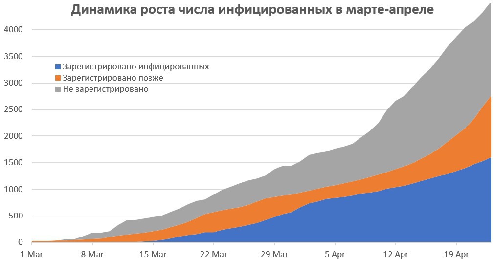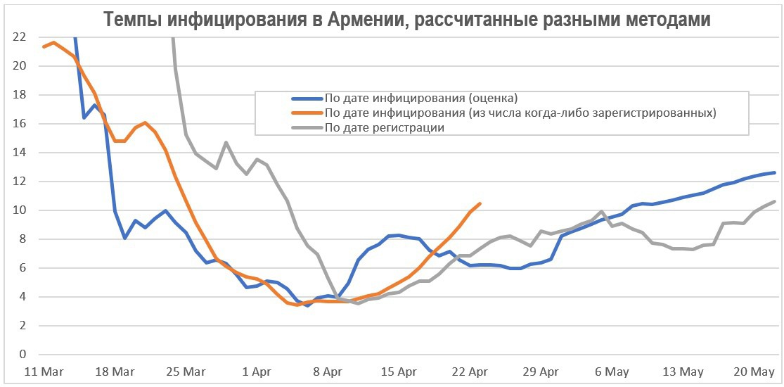 Это консервативный расчет; большинство коллег со мной не соглашаются и считают, что числа и того выше. Но на данный момент я предполагаю именно эти цифры верными. Если это действительно так, то на 23 апреля в Армении было 4,5 тыс. инфицированных (большинство активных), из которых правительству было известно лишь о 1.6 тыс. инфицированных, а 1160 человек были зарегистрированы позже. С тех пор произошел резкий рост числа инфицирования и по моей оценке на 22 мая их число составило 38.6 тыс. чел., в том числе 6.2 тыс. зарегистрированных и еще до 4 тыс. будут зарегистрированы позже.
