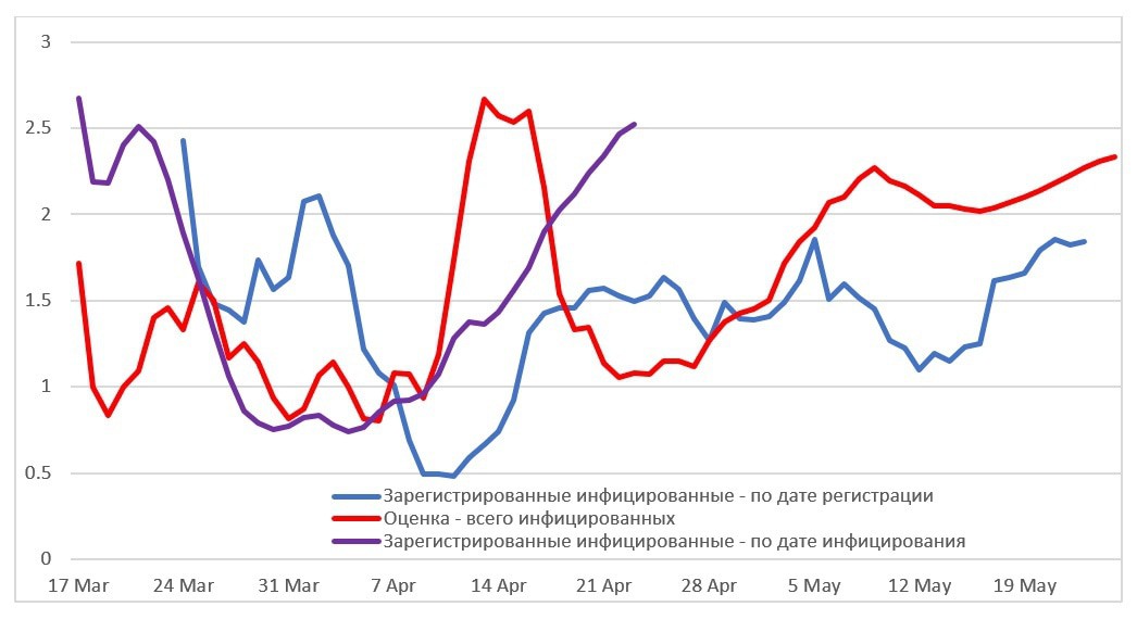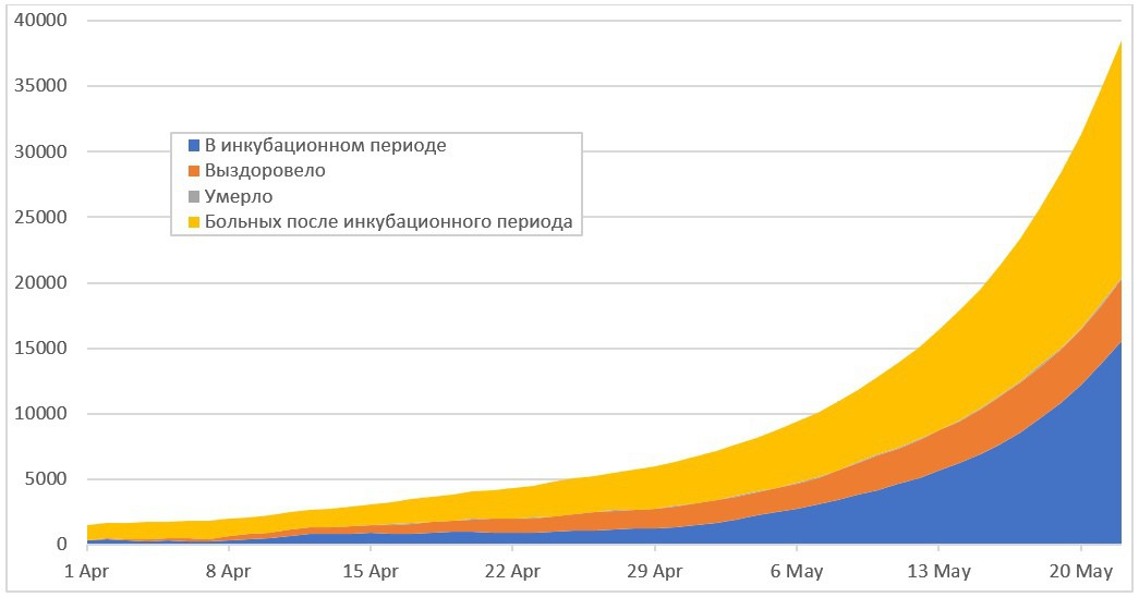 Итак, по состоянию на конец дня 22 мая в стране было (оценочно) 18.2 тысячи заразных больных, тогда как зарегистрированных, а также 15.6 тыс. больных в инкубационном периоде, которые в ближайшее время тоже станут заразными. Это также означает, что по состоянию на 22 мая заразными были 0.6% населения, а из зараженных лишь 16% были зарегистрированы. К концу дня 25 мая заразными будет 25.3 тыс. чел., и это число будет расти на примерно 12.5% в сутки (близко к естественной скорости распространения коронавируса).