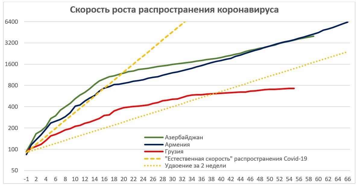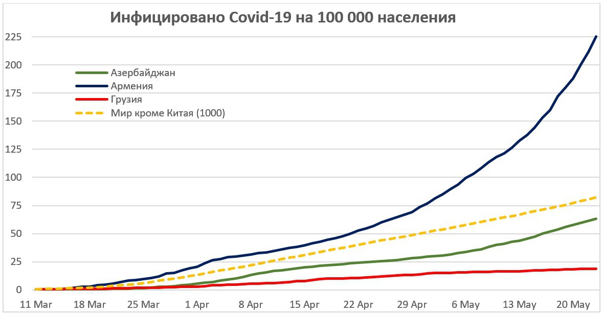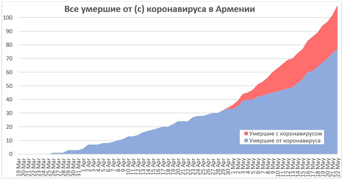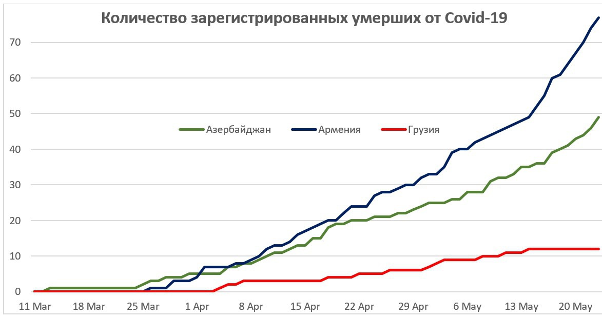 В дискурсах руководства Армении регулярно возникал вопрос об искажении статистики. То говорили про Грузию (вчера вообще министр здравоохранения своими высказываниями вызвал в Грузии скандал), то про Россию, и все время так с приколом, что мол может нам тоже начать фальсифицировать цифры? (см. также: Коронавирус на Кавказе: «грузинский пример» и «армянский ответ»). В действительности цифры не фальсифицируют, но добавлена графа «умершие с коронавирусом» - такой графы нет ни в Азербайджане, ни в Грузии. И нет соответствующего зазора в статистике. Поэтому вышеприведенный график для Армении следует скорректировать.