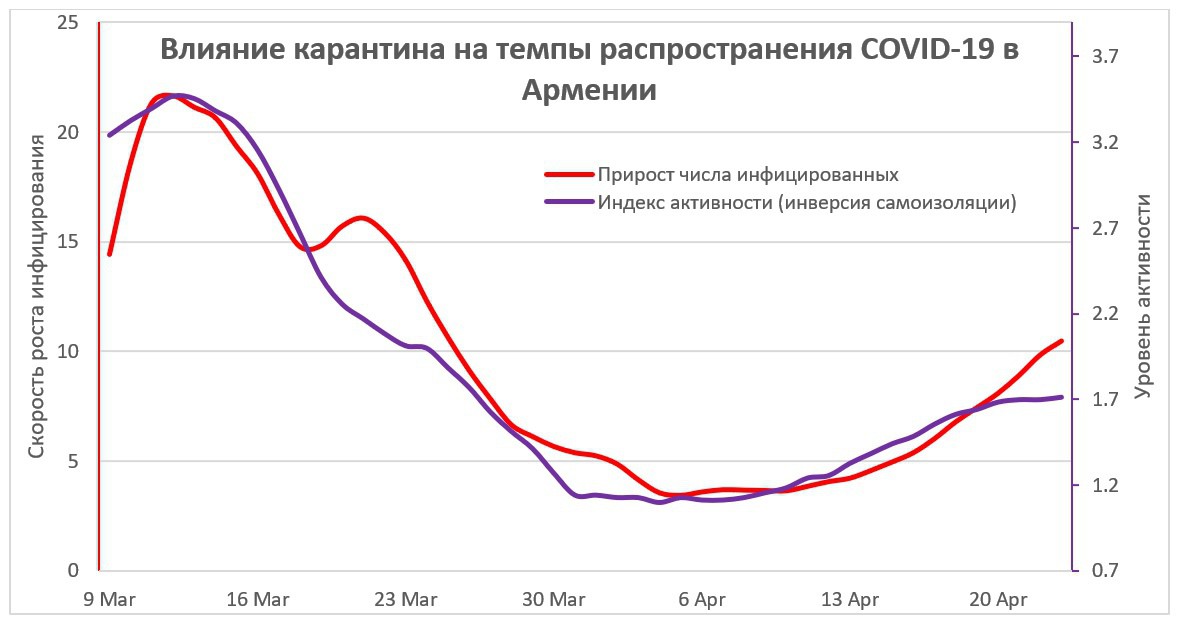 В последнее время звучала спекуляция, что во всем виновата Пасха, 24 апреля и 9 мая (хотя во все эти дни празднования были запрещены); на этом и других графиках мы видим, что это совершенно не так – и ситуация вышла из-под контроля раньше. Всему виной общее несоблюдение карантина, которое распространялось по мере роста несерьезного отношения к COVID-19. Также как и в Дагестане месяц назад, в Армении до сих пор большинство крайне несерьезно относятся к этому вирусу и придерживаются различных теорий заговора относительно вируса вместо того, чтобы понять, что этот вирус представляет угрозу. Власти со своей стороны оказались не в состоянии и не проявили достаточной воли для того, чтобы заставить население соблюдать карантин. На графике ниже демонстрация корреляции соблюдения карантина и интенсивности распространения коронавируса.