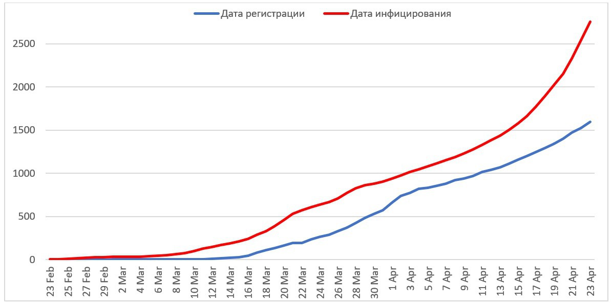 Как мы видим, вплоть до начала апреля регистрация происходила опережающими темпами, а со второй половины – наоборот количество фактов инфицирования начало резко нарастать, и регистрация отставала. К примеру, в период с 17 по 23 апреля было инфицировано 1093 человека из числа тех, что были впоследствии зарегистрированы, а в эти же дни было зарегистрировано лишь 395. Отставание от даты регистрации выглядит следующим образом (накопленным итогом).
