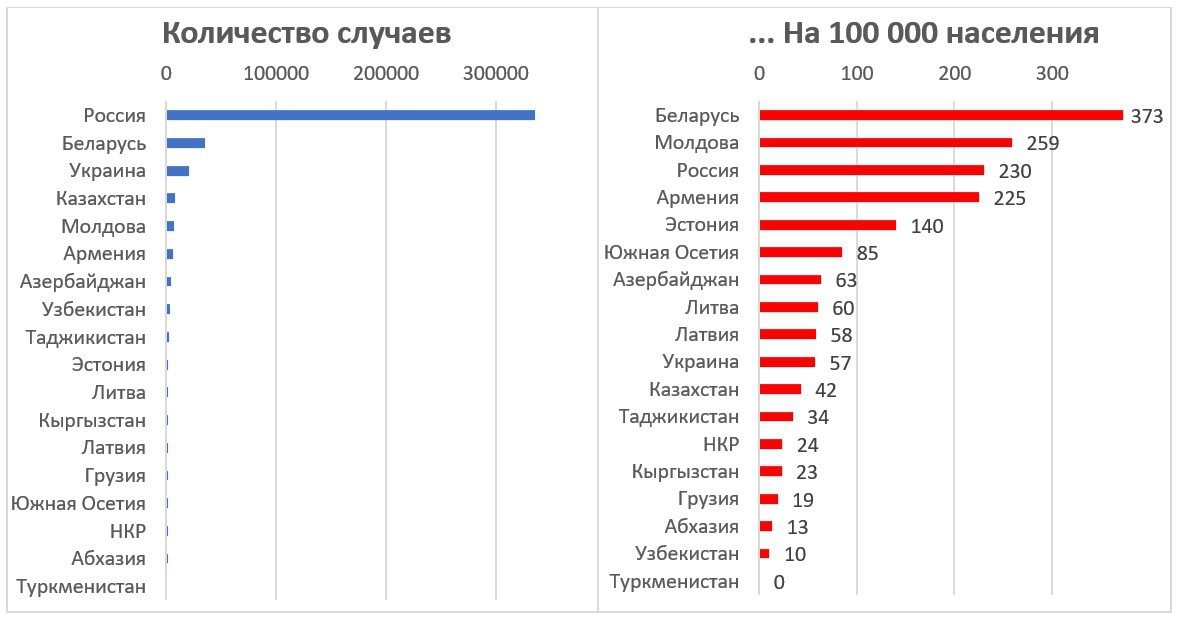 График 6. Страны и территории бывшего СССР по заболеванию коронавирусом, распространенность в населении