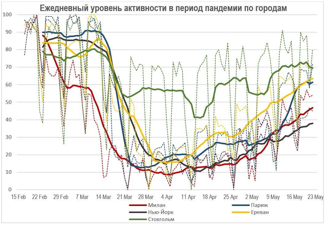 Уже после заполнения графика я увидел, что данные индексы являются относительными для каждого города и не вполне сопоставимы между городами. Поэтому, уровень активности в Стокгольме в действительности следует считать выше, чем это получается на графике. Для остальных же приведенных городов соотношения в целом сопоставимы. На графике мы видим, что в Ереване строгий карантин держался меньше всего. Если смотреть на жирные линии (7-дневные средние), то ниже 30% средний уровень активности держался 19 дней в Ереване, 48 дней в Нью-Йорке, 48 дней в Париже и 53 дня в Милане. Очевидно, тех 19 дней, что в Ереване был строгий карантин, оказалось недостаточно.