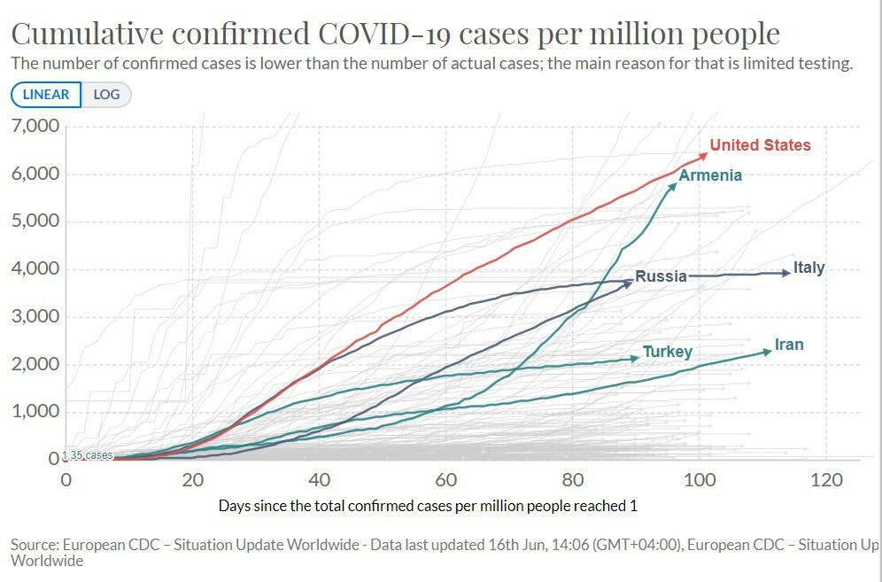 На следующем графике мы можем увидеть кумулятивный рост числа случаев и также можем оценить траектории разных стран. (число случаев накопленным итогом). Для сравнения выбрано несколько стран с хорошо известной траекторией. Также, здесь уже линейная шкала, а не логарифмическая. На графике мы можем увидеть, что хотя Армения и обогнала Соединенные Штаты Америки по числу активных случаев, но по числу случаев к населению на ту же дату с момента начала эпидемии Америка все еще впереди. Также, видно, что и здесь Армения вырывается вперед.