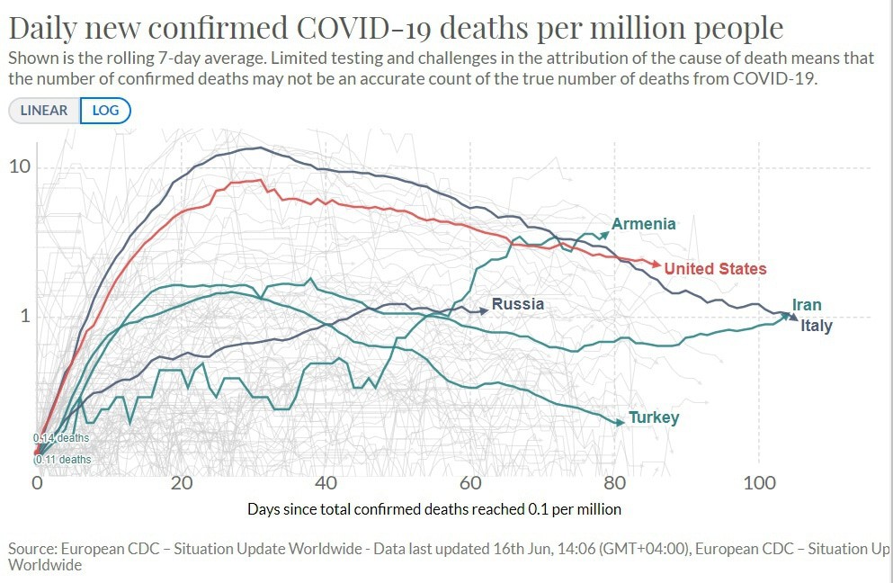Точно известно, что во всех странах в этом списке была неполнота учета, особенно высокая в России. Но характерно, что уже спустя почти три месяца после развития эпидемии, в Армении продолжается рост и страна уже опережает те страны, которые раньше прошли пик. Пик, который сейчас в Армении, не столь выражен, как это было в Италии или США, но поскольку настоящий пик еще не достигнут, мы об этом уверенно не можем судить. К тому же, учитывая предыдущие графики, рост еще неизбежно будет продолжаться.