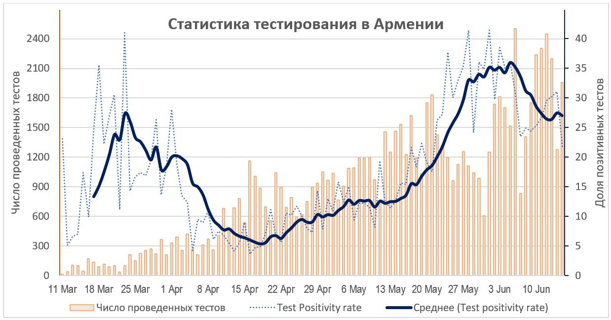 График 1. Динамика тестирования в Армении и доли позитивных тестов, 11 марта – 15 июня 2020 г.
