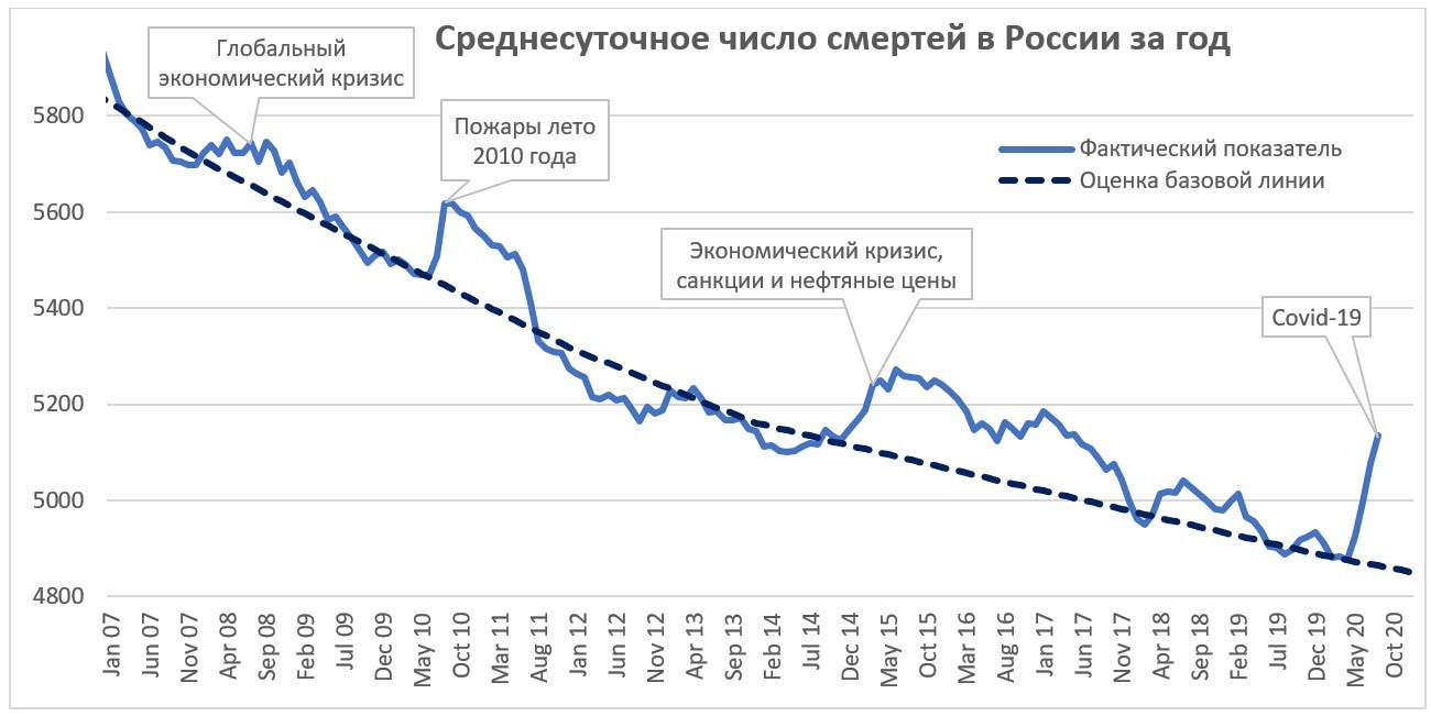 Оценочная реальная смертность от коронавируса или случаев, где коронавирус способствовал наступлению смерти и вызвал ее как минимум на 4 месяца раньше ожидаемого срока, составляет на данный момент около 103 тысяч против 18 тысяч цифры, официально объявленной к настоящему моменту. Росстат же идентифицировал ковид как основную или сопутствующую причину смерти в 38 тысячах случаев в апреле-июле, а к настоящему моменту это число следует оценивать в близкое к 50 тысячам. Таким образом, занижение статистики, отправляемой в ВОЗ, является почти 6-кратным, а скорее близко к 5.5 крат. Это ниже, чем в Беларуси, где занижение почти 14-кратное, либо в Азербайджане, где это примерно 10 раз.