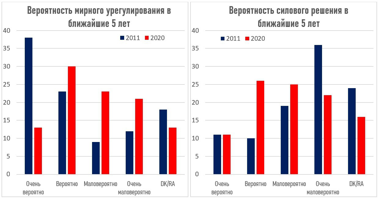 Если в 2011 году 61% считали мирное решение вероятным и 21% - маловероятным (+40%), то в 2020 году эти цифры составляли 43% и 44% соответственно (-1%). Сейчас они изменятся еще сильнее. По поводу военного решения, в 2011 году вероятным его считали всего 21% и маловероятным 55% (-34%), то в 2020 году 37% и 47% соответственно (-10%). Это хорошо характеризует тупик переговорного процесса и нарастание эскалации. Второй блок вопросов касался вариантов урегулирования конфликта, и их предпочтения в обществе.